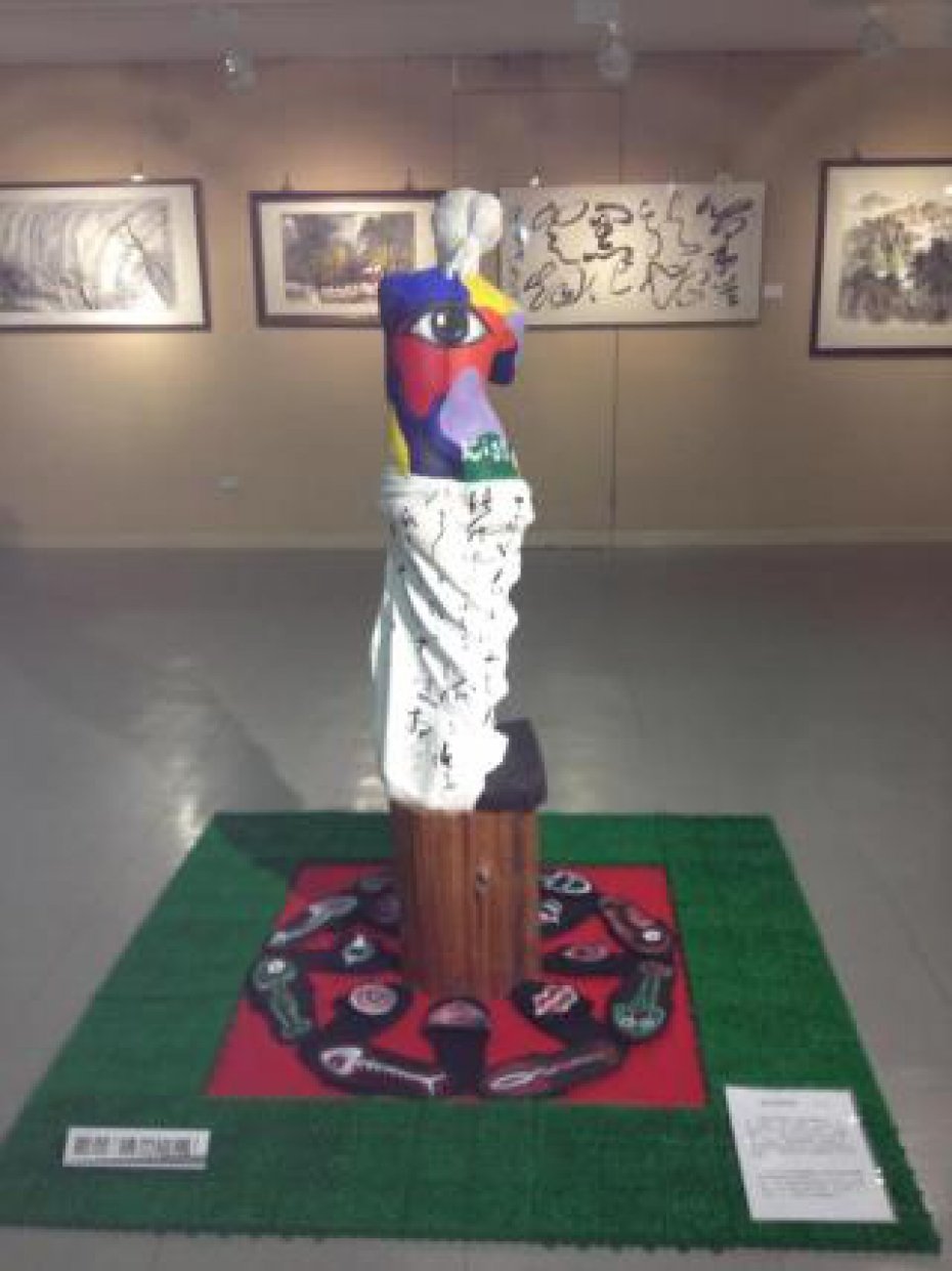 本件作品是裝置藝術,直接在維納斯雕像彩繪書寫東方書法文字、kiss me、 love me,背上有隻大眼睛來看人看不到的世界啦!座下排了個八卦陣,是什麼 [ 八卦陣 ] ? 就自己去瞧瞧啦 !!